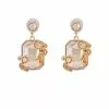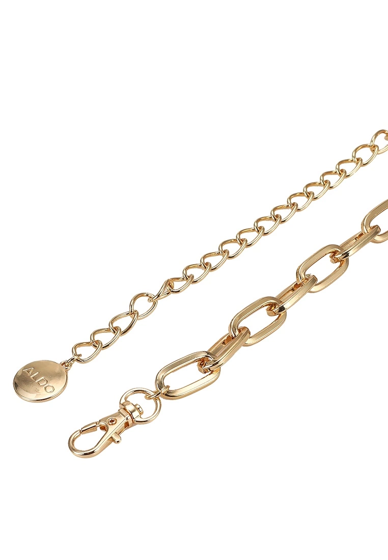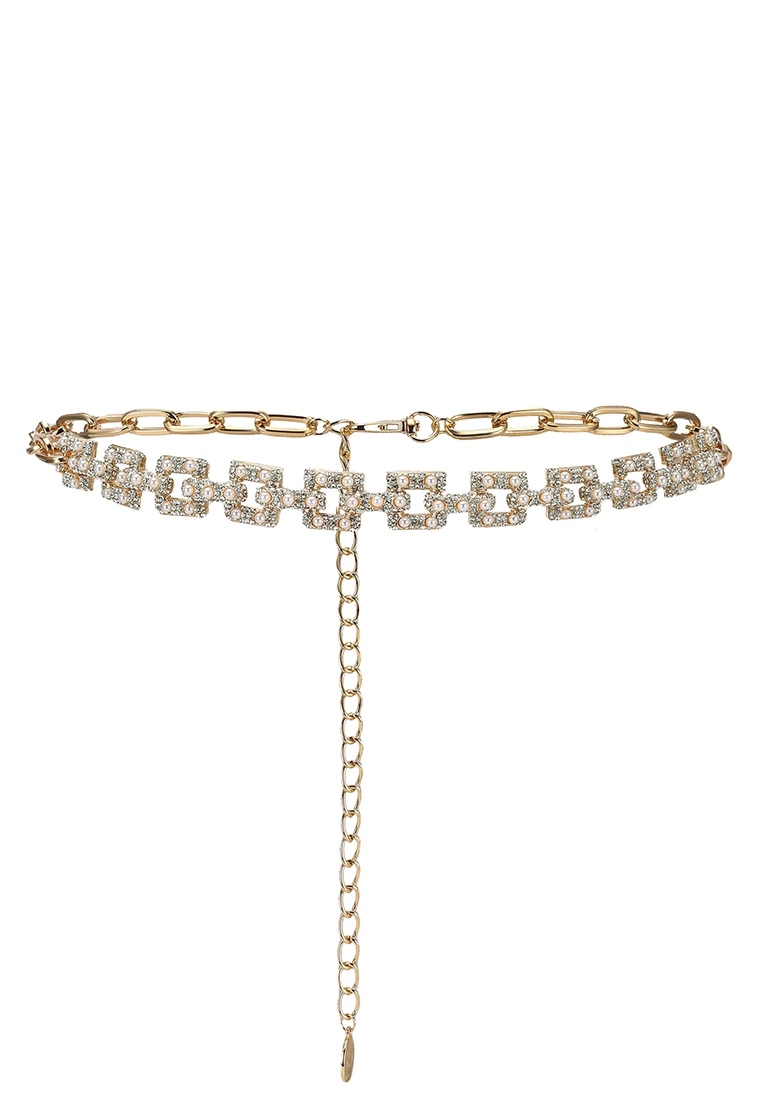 – Gold tone metal chain belt with faux gems and pearls embellishment