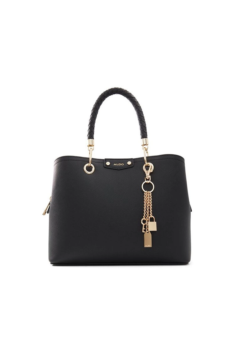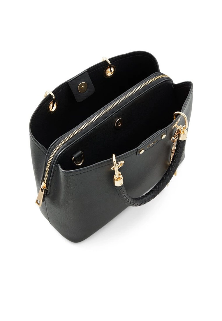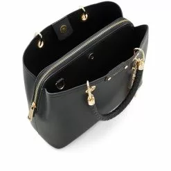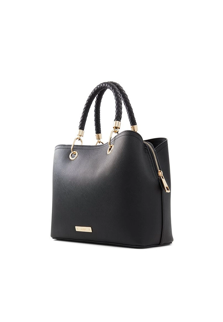 – Solid shade faux leather tote bag with weaved handles