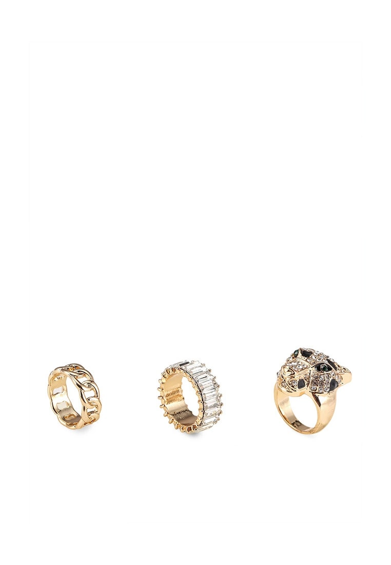 – Gold tone assorted embellished rings with animal and chain linked motif